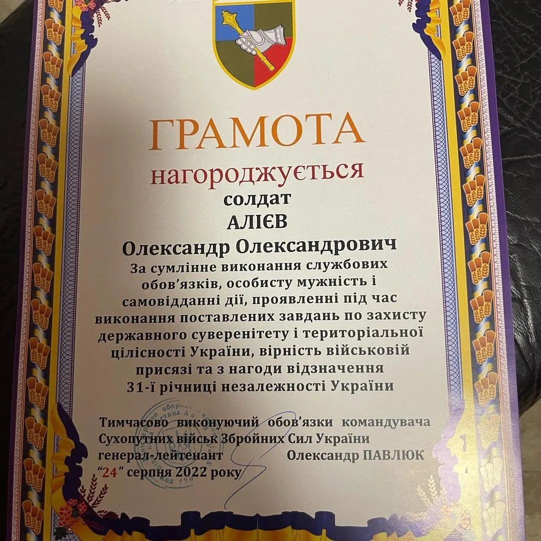За такую патриотическую позицию и мужество Алиев получил грамоту от ВСУ. Александр получил благодарность, посвященную 31-й годовщине независимости Украины. Бывший футболист благодарен за такое отличие.