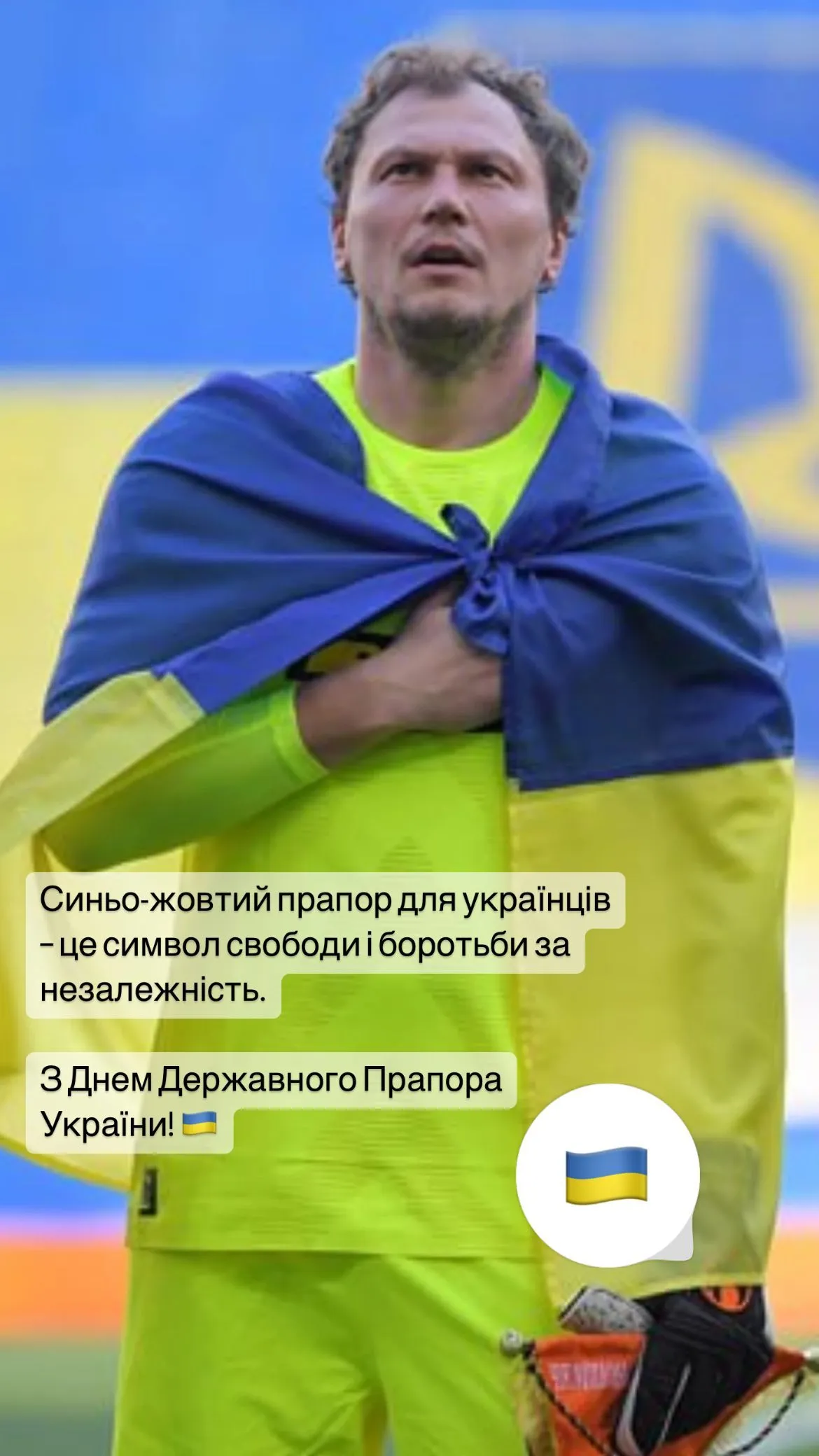 К поздравлениям присоединились украинские футболисты. Бывший голкипер Шахтера и сборной Украины, а ныне представитель тренерского штаба "горняков" Андрей Пятов напомнил, что сине-желтое знамя для украинцев – это символ свободы и борьбы за независимость.