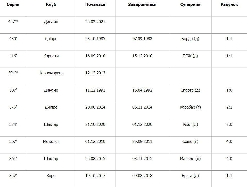 Безголевые серии украинских клубов в еврокубках / Таблица Sport.ua