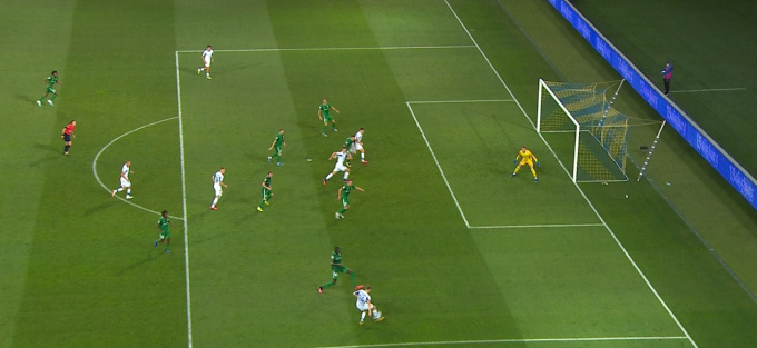 Передачу с фланга замкнул Вербич (на фото – ближний из тех, кто в центре), который не был в офсайде. Возможно, боковой рефери перепутала с игроком (Де Пена), который находился вне игры (за Вербичем).