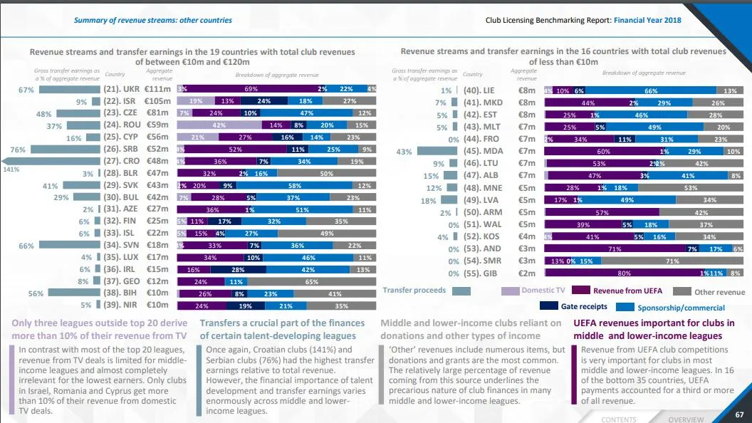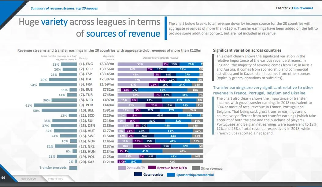 Выручка клубов из Англии составила более 5,4 миллиарда евро, говорится в отчете УЕФА. 53% составляет доход от домашних телеправ. 26% – спонсорские контракты.