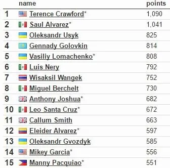 На первой позиции и в дальнейшем Теренс Кроуфорд, второй – Сауль Альварес. Также Василий Ломаченко и Александр Усик сохранили свои позиции.