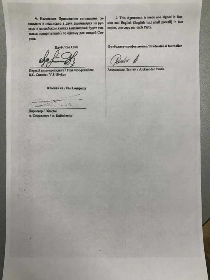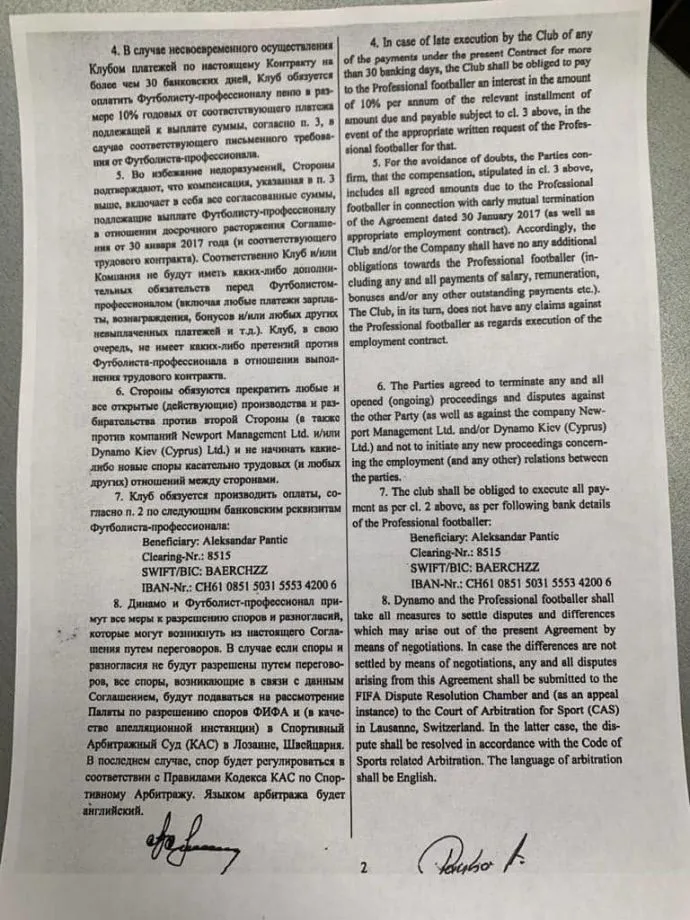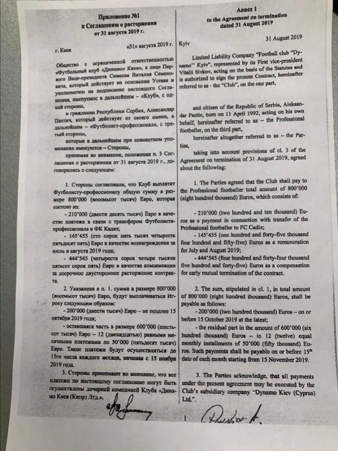 Фото договора между "Динамо" и Пантичем о расторжении контракта (фото: ЭП)