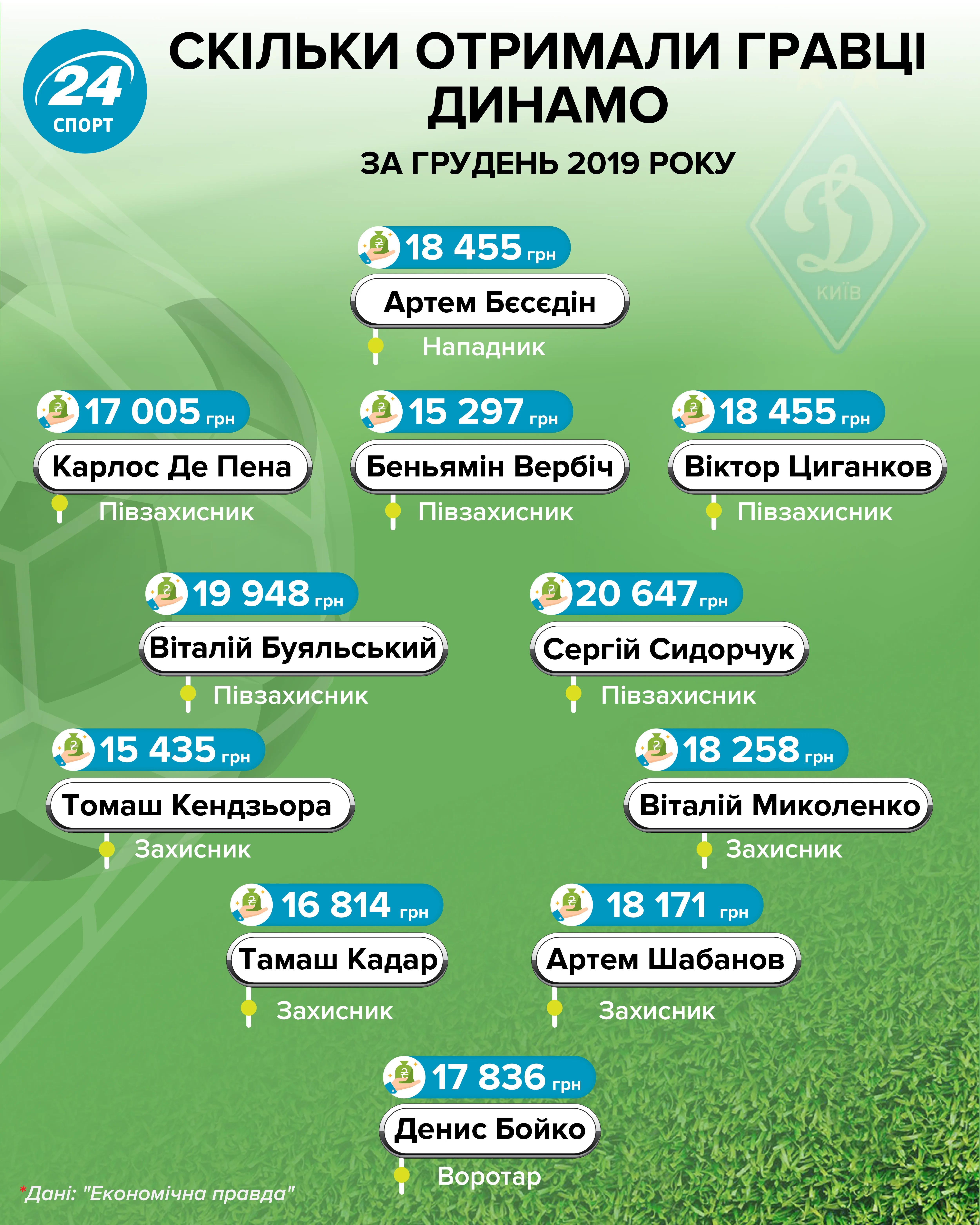 Информацию из зарплатной ведомости "Динамо" за декабрь 2019 года опубликовало издание "Экономическая правда". В документе указано, что среди игроков команды наибольшую зарплату официально получает Сергей Сидорчук – 20647,13 гривны в месяц. Один из лидеров команды – Виктор Цыганков – 18455,58 гривны. Легионер Беньямин Вербич – 15297,19 гривны.