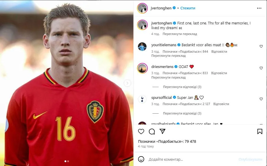 Настоящая легенда сборной Бельгии объявил о своем решении в инстаграме. Ян Вертонген опубликовал две фотографии: с первого и последнего матча за "красных дьяволов".