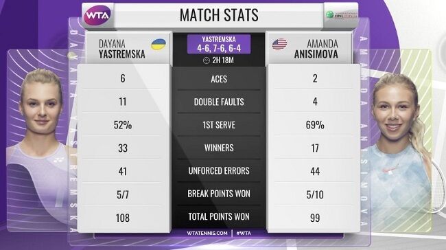 Ястремская выполнила 6 эйсов, совершила 11 двойных ошибок и реализовала 5 из 7 брейкпоинтов.