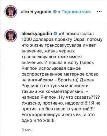 "Я пожертвовал 1000 долларов проекту Окра, потому что жизнь транссексуалов имеет значение, Жизнь черных транссексуалов тоже имеет значение. И пошла в жопу Джоан Роулинг с ее тупым мнением и такими же комментариями", – заявил спортсмен.