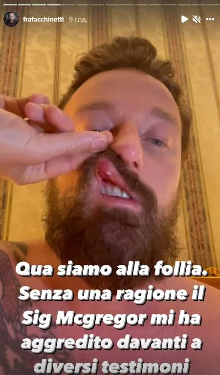 В своем инстаграме Факкинетти показал последствия вероятного удара от МакГрегора. У певца разбита губа.