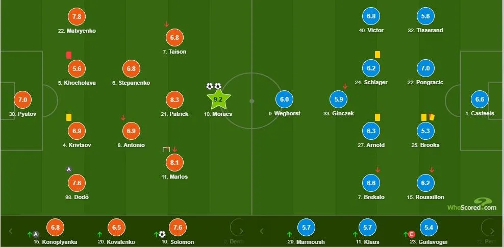 Жуниор Мораес дважды отличился на последних минутах встречи и стал настоящим героем дончан. Эксперты Whoscored не прошли сторой от таких удачных действий украинца и поставили ему наивысшую оценку среди всех футболистов обеих команд.