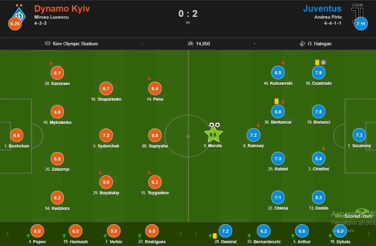Лучшим во встрече в обойме двух команд стал испанский нападающий "Ювентуса" Альваро Мората – 8,5. Именно испанец дважды заставил голкипера "Динамо" Георгия Бущана вынимать мяч из собственных владений.