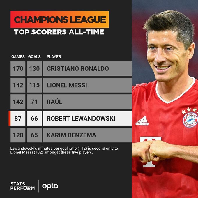Также Левандовски вышел на четвертое место среди бомбардиров Лиги чемпионов (66 голов), опередив француза Карима Бензему.