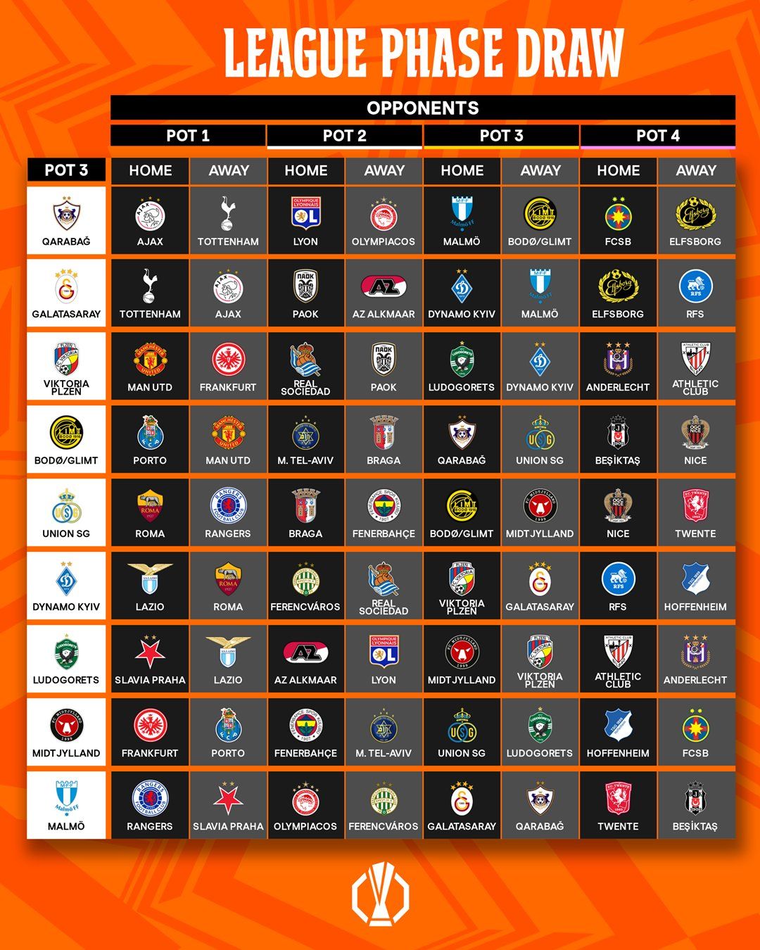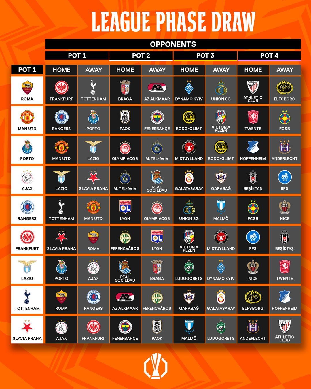 - Корзина 1: Рома (Италия) Манчестер Юнайтед (Англия), Порту (Португалия), Аякс (Нидерланды), Рейнджерс (Шотландия), Айнтрахт (Германия), Лацио (Италия), Тоттенхэм (Англия) и Славия Прага (Чехия)
