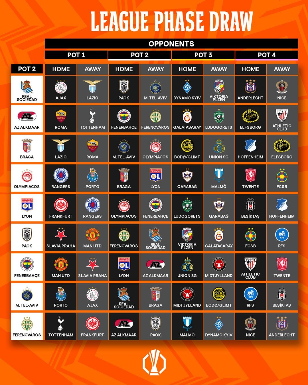 - Корзина 2: Реал Сосьедад (Испания), АЗ Алкмаар (Нидерланды), Брага (Португалия), Олимпиакос (Греция), Лион (Франция), ПАОК (Греция), Фенербахче (Турция), Маккаби Тель-Авив (Израиль) и Ференцварош (Венгрия).