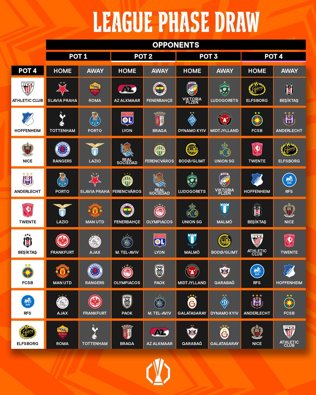 - Корзина 4: Атлетик Бильбао (Испания), Хоффенхайм (Германия), Ницца (Франция), Андерлехт (Бельгия), Твенте (Нидерланды), Бешикташ (Турция), ФКСБ Стяуа (Румыния), РФШ (Латвия) и Эльфсборг (Швеция)