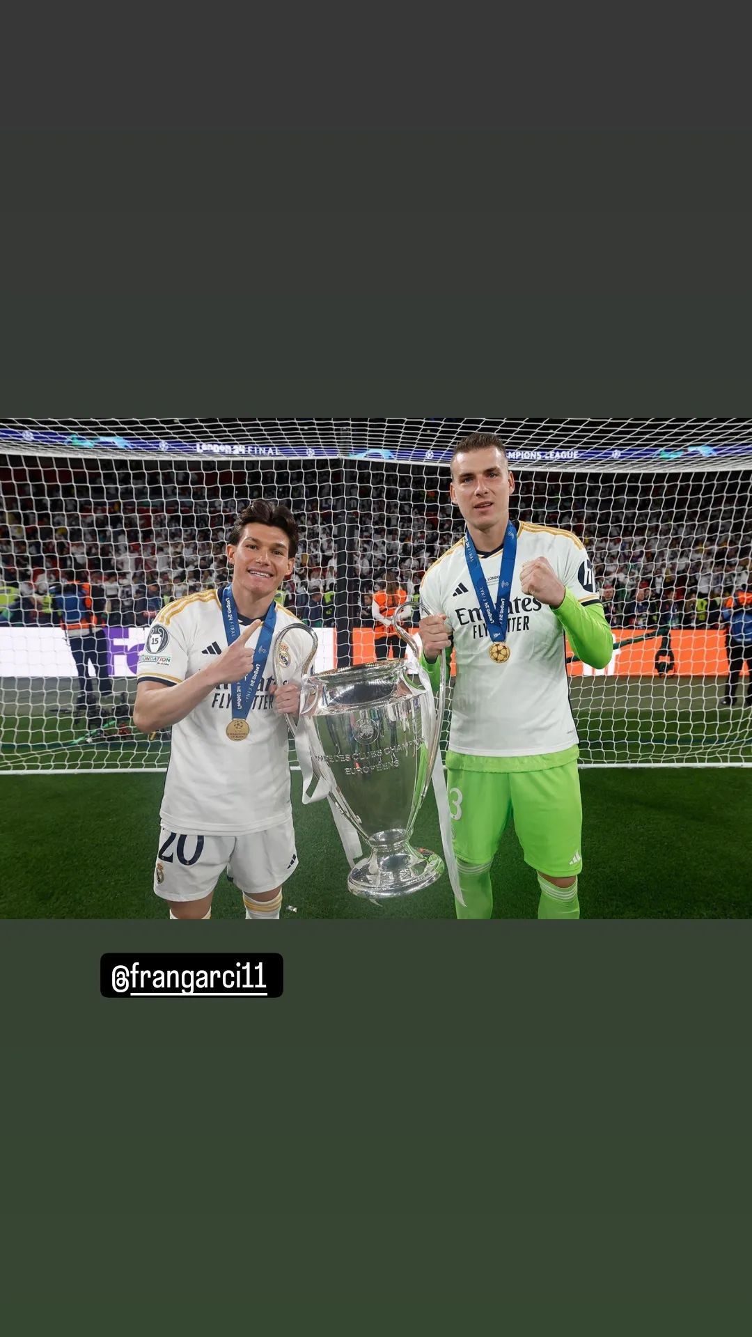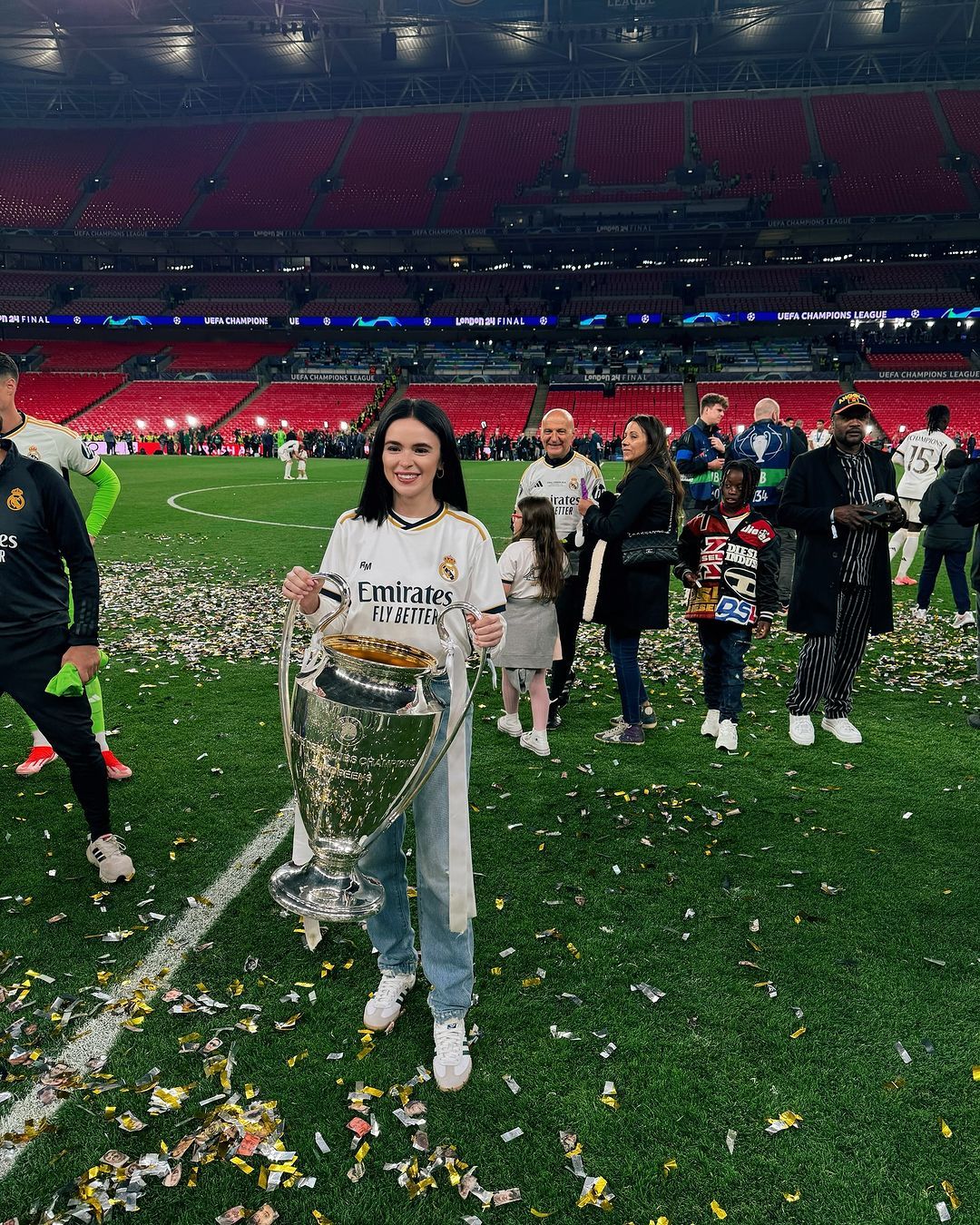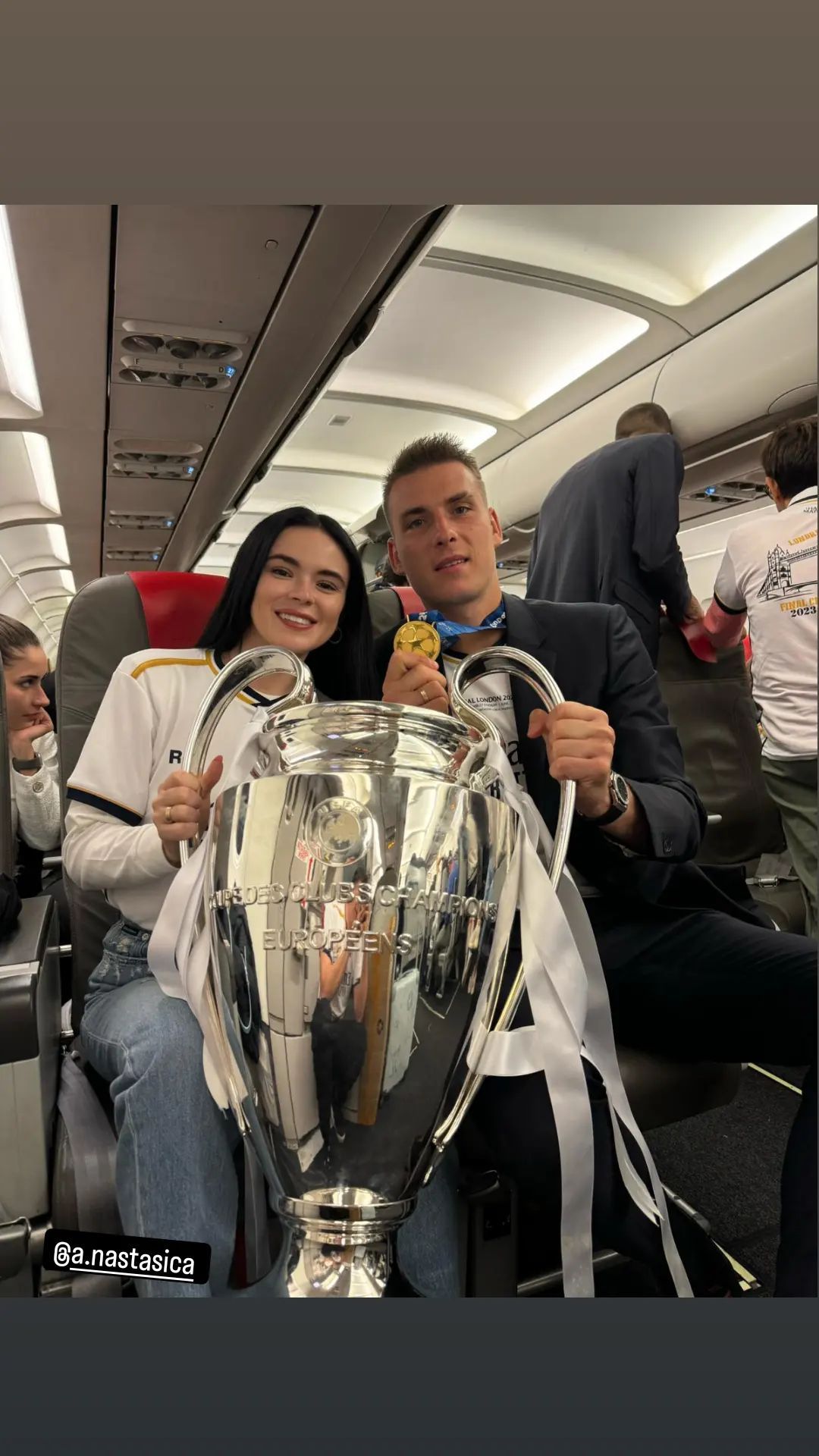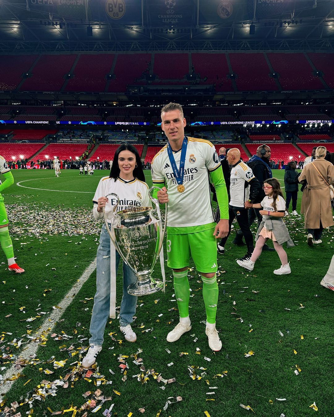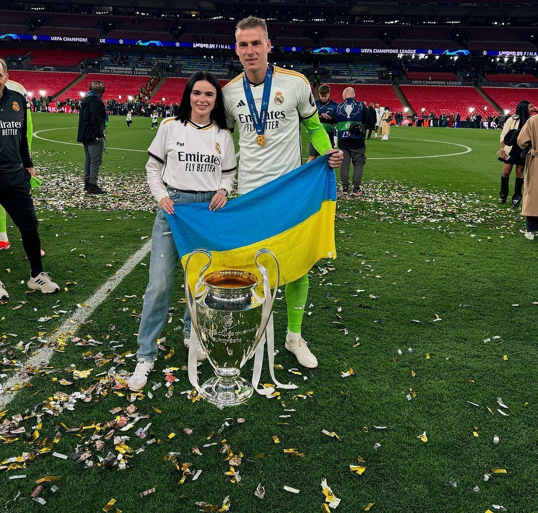 После триумфа на "Уэмбли" Лунин сделал несколько фотографий с кубком Лиги чемпионов. Вместе с голкипером была его жена Анастасия, которая приехала на финал.