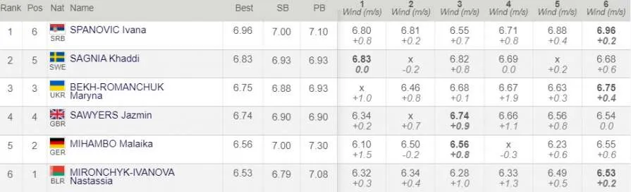 В шестой попытке украинка показала результат 6,75 метров. Это позволило ей опередить британку Джазмин Соерс, у которой лучший прыжок – 6,74 м. Победу в финале и во всем сезоне праздновала представительница Сербии Ивана Шпанович.