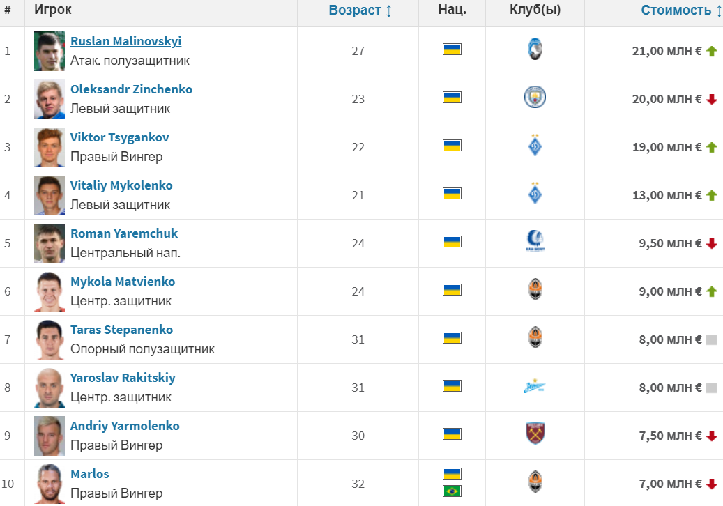Малиновский поднялся на первое место после того, как игрок "Манчестер Сити" Александр Зинченко подешевел на 4 миллиона евро и опустился на вторую строчку. Теперь он стоит 20 миллионов евро, тогда как 8 апреля оценивался в 24.