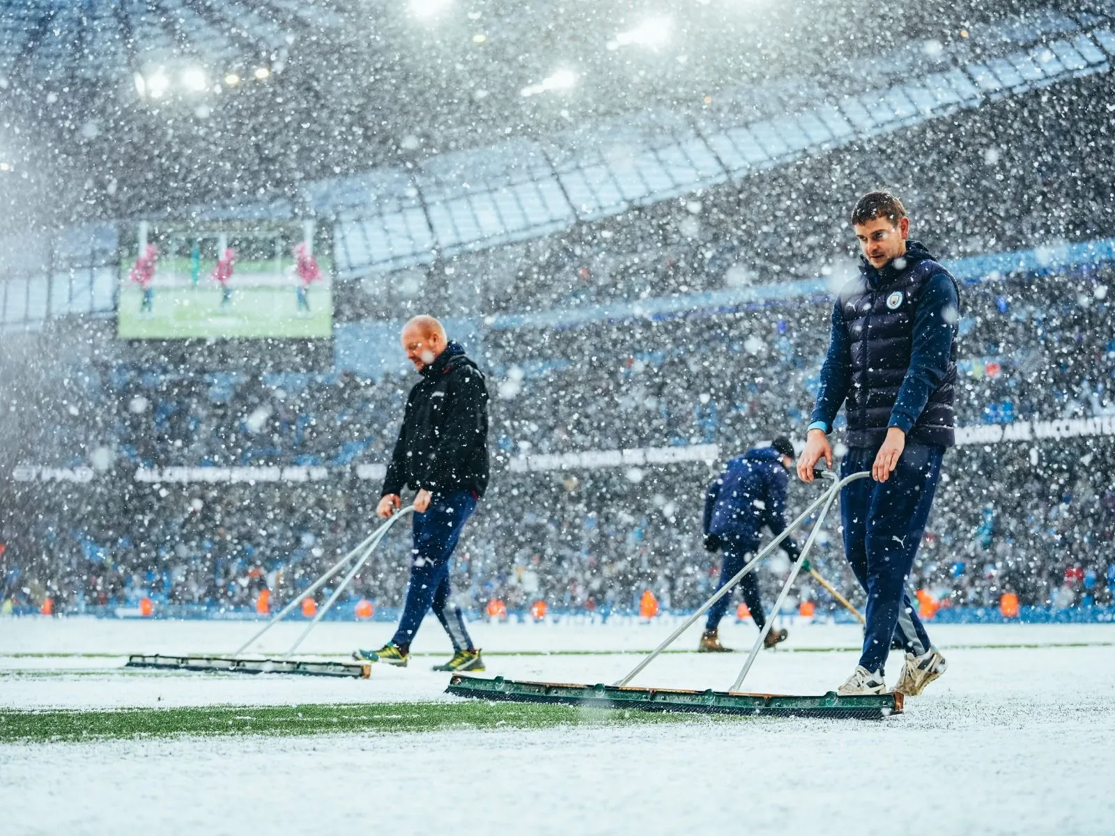 Манчестер Сити и Вест Хэму в очном матче пришлось адаптироваться не только друг к другу, но и к условиям. В течение первого тайма поле засыпало снегом.