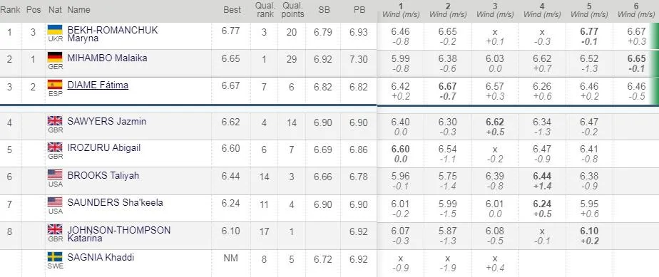 Украинка с прыжком 6,77 м (2 сантиметра до лучшего результата сезона) квалифицировалась в финальную тройку. В шестом прыжке Марине удалось опередить свою конкурентку Малайку Михамбо также на 2 сантиметра.