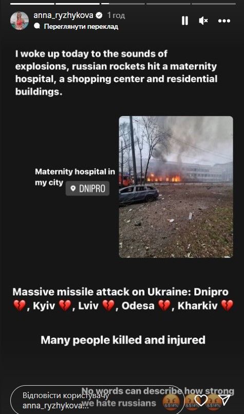 Не менее эмоциональной была легкоатлетка Анна Рыжикова, пробудившаяся в родном Днепре от звуков взрывов. Спортсменка добавила фотографию роддома в своем родном городе, куда попал враг.
