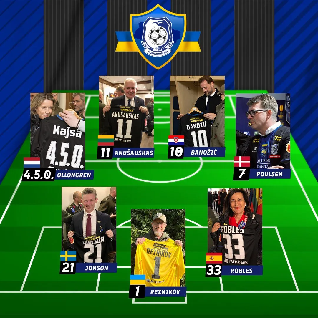 У себя в Twitter Алексей Резников опубликовал фотоколлаж с "обновленным составом" Черноморца. В него вошли министры обороны, побывавшие в Одессе с начала российской агрессии. Кроме поставившего себя в воротах украинского чиновника в состав "моряков" попали: Кайса Оллонгрен (Нидерланды), Арвидас Анушаускас (Литва), Марио Баножич (Хорватия), Троэльс Лунд Поульсен (Дания), Пол Йонсон (Швеция) и Маргарита (Испания).