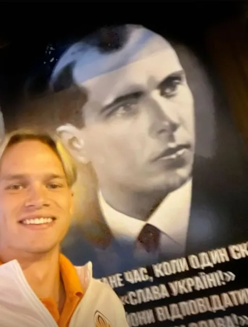 Левый вингер Шахтера не только дает интервью на украинском языке, но и запомнился патриотическим фото в своих соцсетях. Михаил Мудрик сделал фото на фоне портрета Степана Бандеры.
