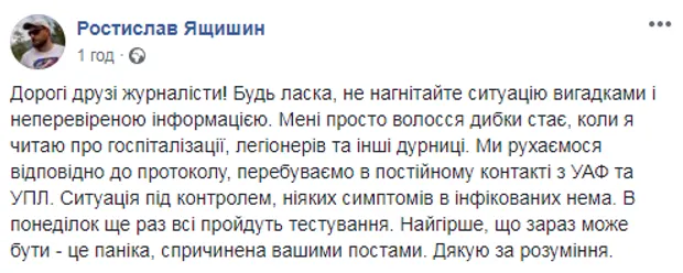 Мы движемся в соответствии с протоколом, находимся в постоянном контакте с УАФ и УПЛ. Ситуация под контролем, никаких симптомов у инфицированных нет. В понедельник еще раз все пройдут тестирование. Хуже всего, что сейчас может быть – это паника, вызванная вашими постами. Спасибо за понимание,