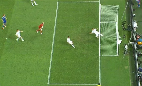 Джон Терри выбивает мяч уже за линии ворот после удара Девича в матче Украина – Англия. Арбитр Виктор Кашшаи не засчитал в этом эпизоде гол (фото: Трибуна)