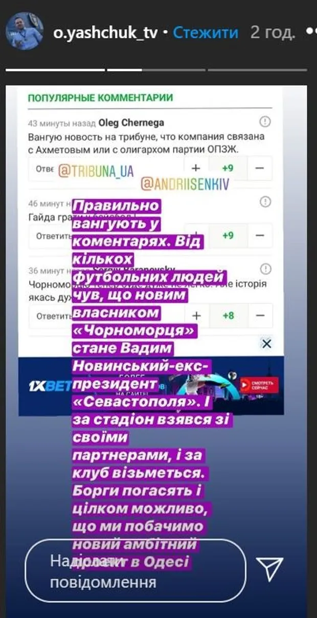 От нескольких футбольных людей слышал, что новым владельцем "Черноморца" станет Вадим Новинский, экс-президент "Севастополя". И за стадион взялся со своими партнерами, и за клуб возьмется. Долги погасят, и очень возможно, что мы увидим новый амбициозный проект в Одессе,
