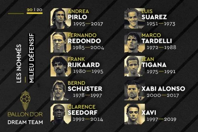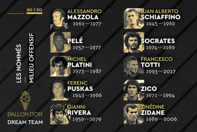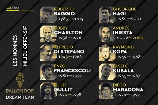 В общем France Football составит свою сборную лучших игроков в истории футбола по схеме 3-4-3. Поэтому будет избран лишь однин центральный защитник, зато сразу два опорных полузащитника и два атакующих полузащитника. В категорию последних попали и некоторые нападающие.