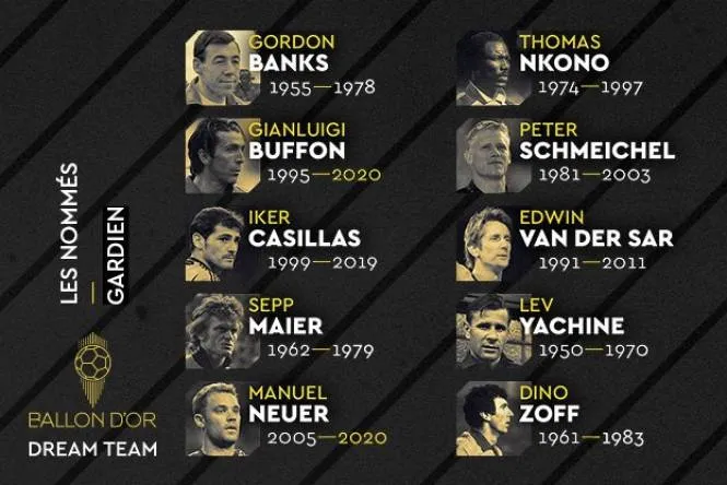 Вратари: Гордон Бэнкс, Джанлуиджи Буффон, Дино Дзофф, Икер Касильяс, Сепп Майер, Томас Нкоко, Мануэль Нойер, Эдвин ван дер Сар, Петер Шмейхель, Лев Яшин.