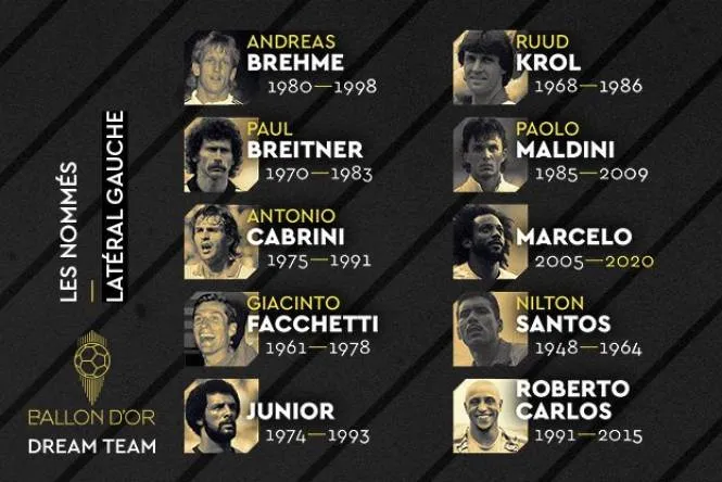 Левые защитники: Андеас Бреме, Пауль Брайтнер, Антонио Кабрини, Жуниор, Руд Крол, Пауло Мальдини, Марсело, Нилтон Сантус, Роберто Карлос, Джанчинто Факкетти.