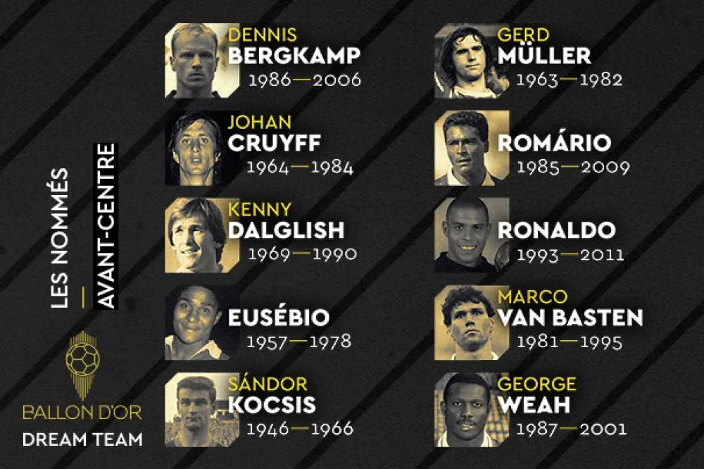 Центральные нападающие: Марко Ван Бастен, Деннис Бергкамп, Джордж Веа, Кенни Данглиш, Эусебио, Шандор Кочиш, Йохан Кройф, Герд Мюллер, Ромарио, Роналдо.