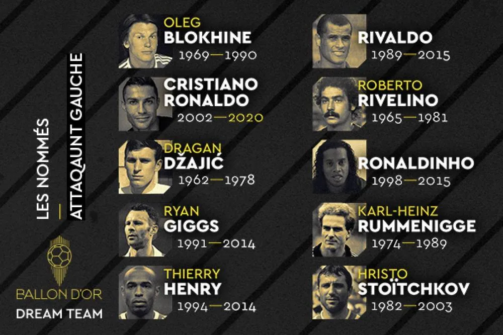 Левые нападающие: Тьерри Анри, Олег Блохин, Драган Джаич, Райан Гиггз, Ривалдо, Роберто Ривелино, Роналдиньо, Криштиану Роналду, Карл-Хайнц Румменигге, Христо Стоичков.