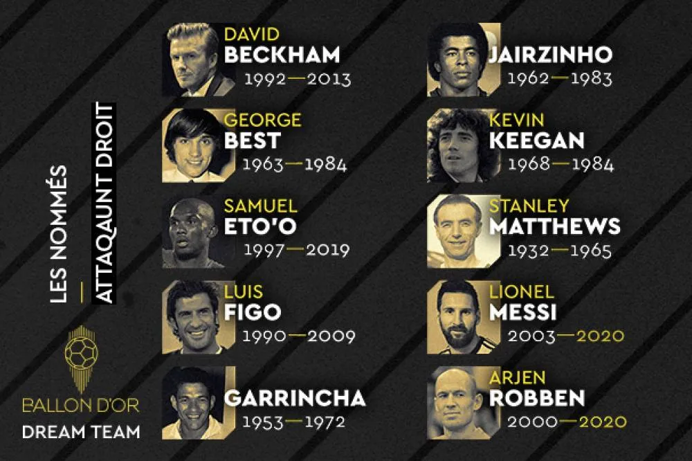 Правые нападающие: Дэвид Бекхэм, Джордж Бест, Гарринча, Жаирзиньо, Самуэль Это'О, Кевин Киган, Стэнли Мэтьюз, Лионель Месси, Арьен Роббен, Луиш Фигу.