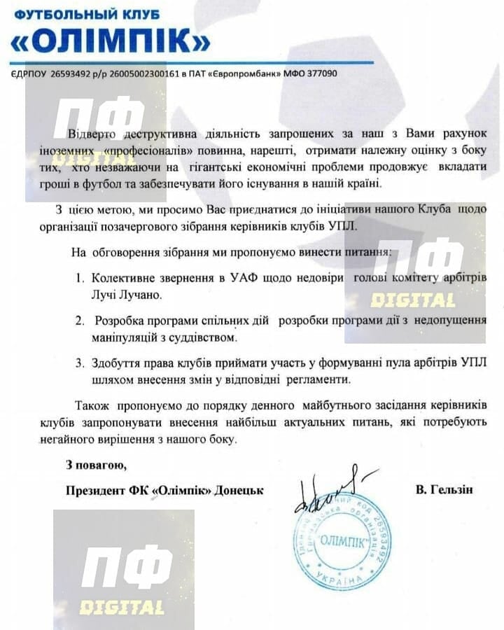 Кроме того, в Олимпике предлагают разработать программу специальных действий, которые не допустят манипуляции с судейством в будущем, а также разрешить клубам УПЛ участвовать в формировании пула арбитров.