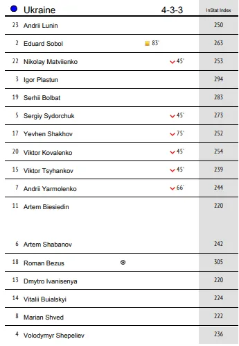 Индекс Безуса по данным Instat составил 305 баллов. В тройку в составе сборной Украины также вошли защитники Игорь Пластун (294 балла) и Сергей Болбат (283).