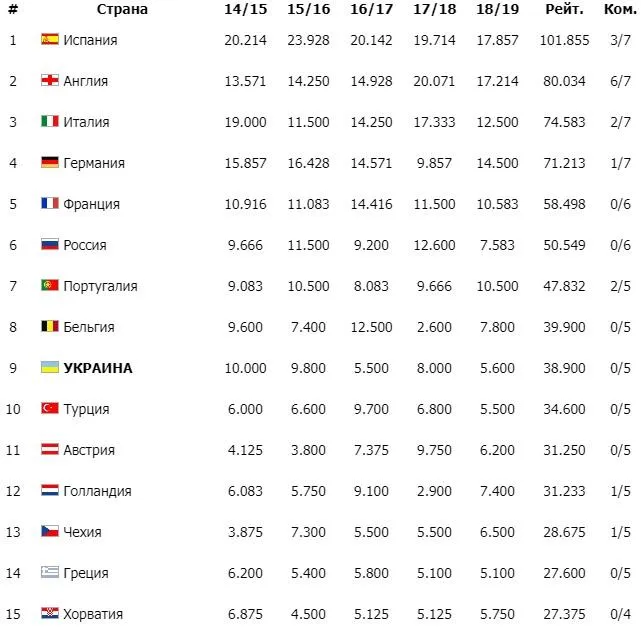 Таблица коэффициентов УЕФА по состоянию на 15 марта // sport.ua