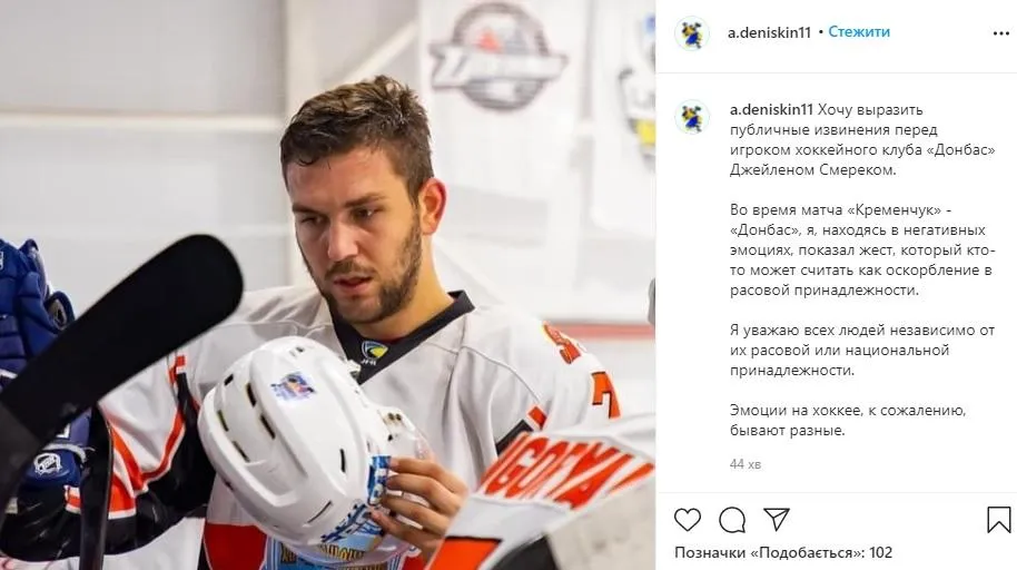 "Хочу выразить публичные извинения перед игроком хоккейного клуба Донбасс Джаленом Смереком. Во время матча Кременчуг – Донбасс, я, находясь в негативных эмоциях, показал жест, который кто-то может считать как оскорбление в расовой принадлежности. Я уважаю всех людей независимо от их расовой или национальной принадлежности. Эмоции на хоккее, к сожалению, бывают разные", – написал хоккеист.