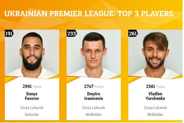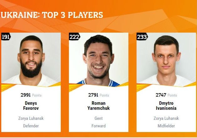 В лидеры среди украинских футболистов довольно неожиданно вырвался защитник Зари Денис Фаворов (191 место). На второй позиции расположился форвард Гента Роман Яремчук (222). Бронза же сейчас в руках хавбека луганчан Дмитрия Иванисени (233).