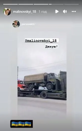 Информацию о покупке грузовика для украинских военных сообщил Владимир Парасюк – бывший народный депутат, а теперь военнослужащий 8-го отдельного полка специального назначения. Он выложил сторис в инстаграм, где рассказал эту историю. Руслан Малиновский сделал ее репост себе.