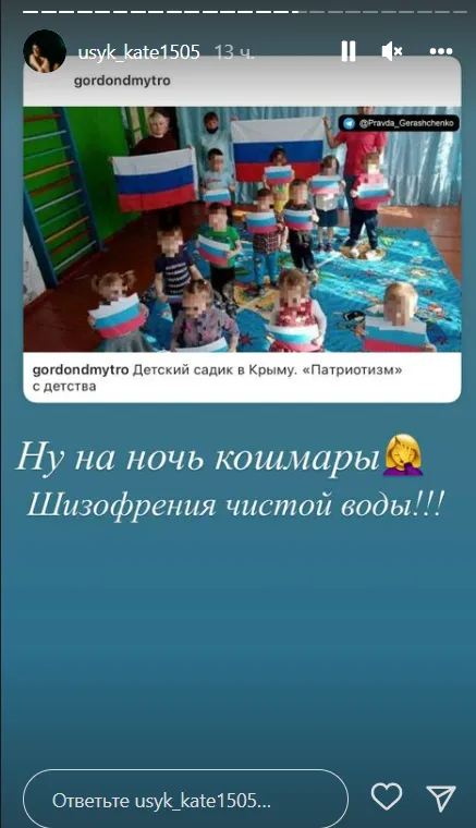 В этот раз Екатерина отреагировала на "патриотическое воспитание" во временно оккупированном Крыму. Жена Легендарного боксера назвала это "произведение искусства" шизофренией.