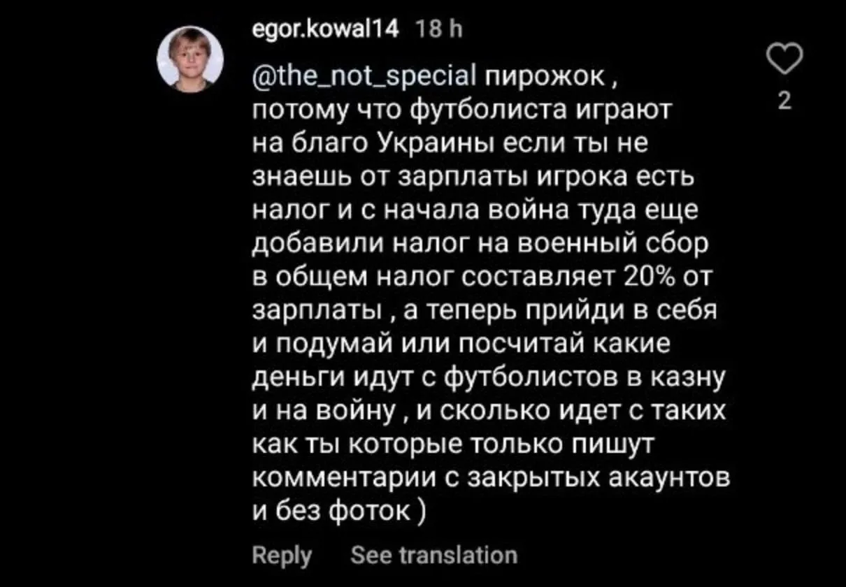 И его слова "нашли поддержку" у других футболистов. По меньшей мере, 25 футболистов и футболисток поставили лайк этому комментарию, фактически одобрив его. Среди них были как игроки Динамо или Шахтера, так и футболистки Кривбасса. А также немало игроков Горняк-Спорта и Металлист 1925. И представители Миная, Руха, ЮКСА, Подолья и Александрии.