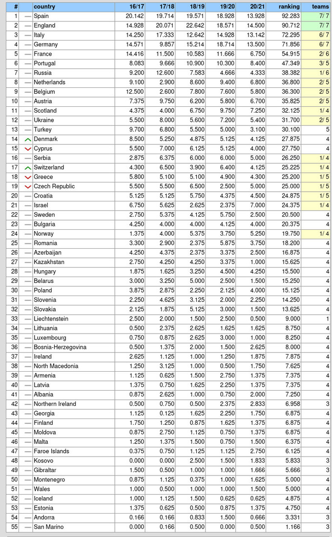 Таблица коэффициентов УЕФА
