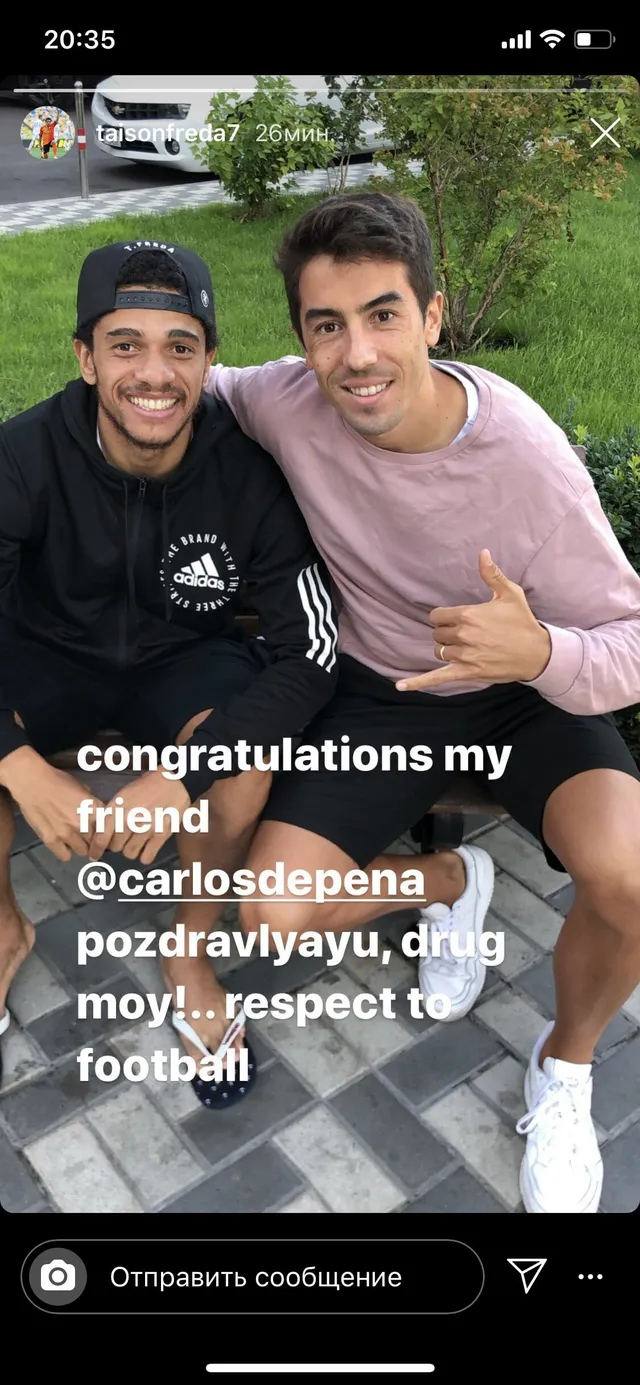 Бразильский легионер "Шахтера" Тайсон поздравил уругвайского игрока "Динамо" Карлоса де Пену в соцсети Instagram: "Поздравляю, друг мой. Респект футболу".