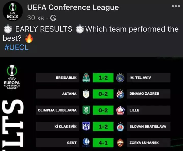 Однако в УЕФА быстро заметили ошибку, удалив пост. Сейчас у публикации с результатами матча правильный логотип луганской Зари.