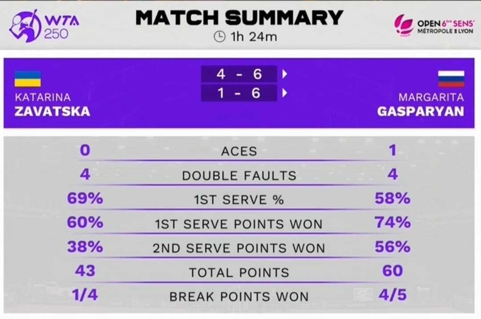 Матч продолжался 1 час и 24 минуты. За это время украинка совершила четыре двойные ошибки и реализовала один брейкпойнт из пяти.