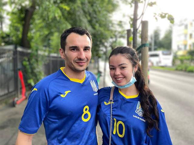 Украинские поклонники гуляют по улицам города, делают фотографии, общаются, шутят и обнимаются. Люди желают успеха сборной Украины по футболу и верят в ее победу.