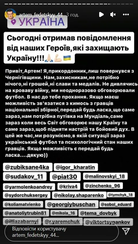 Федецкий немедленно изложил это сообщение в соцсетях, отметив всех футболистов сборной. Некоторые уже успели отреагировать и распространить у себя на странице.