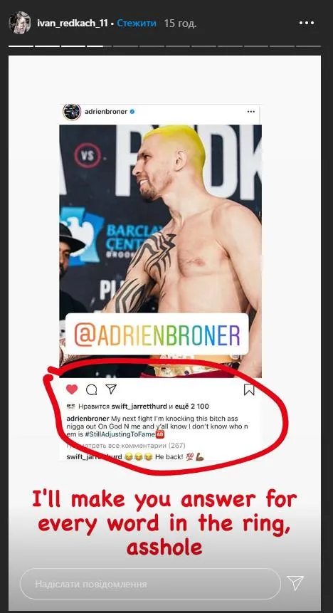 О бое с Редкачем 31-летний Бронер сообщил в своем инстаграме. Он написав, что в следующем бою побьется против украинского полусредневеса Редкача.
